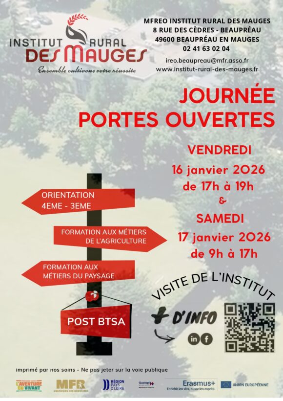 L’Institut Rural des Mauges ouvre ses portes le vendredi 16 janvier de 17h à 19h et le samedi 17 janvier 2026 de 9h à 17h.